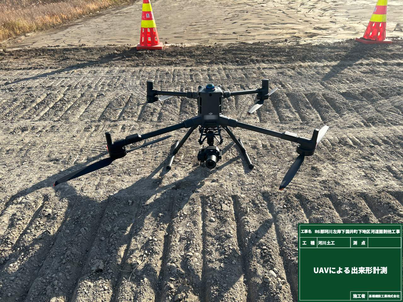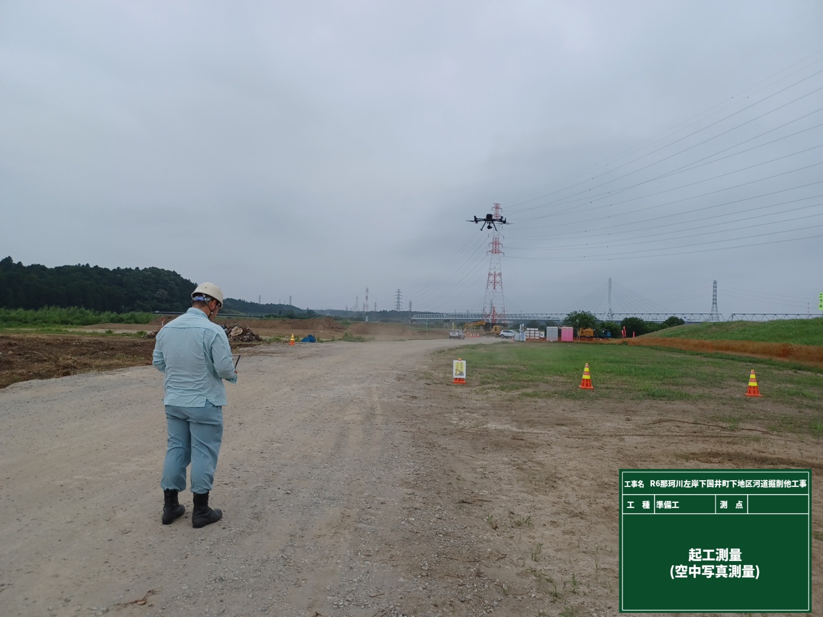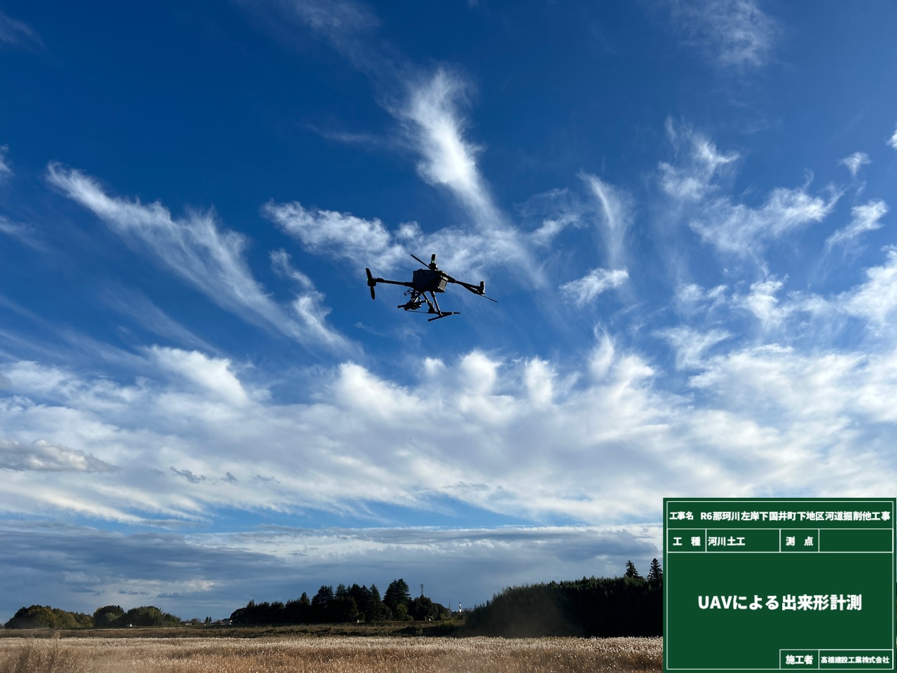 那珂川のすぐ横にある現場では、ドローンを使うことで、人力で測量するよりも安全性も効率も大きく向上します。