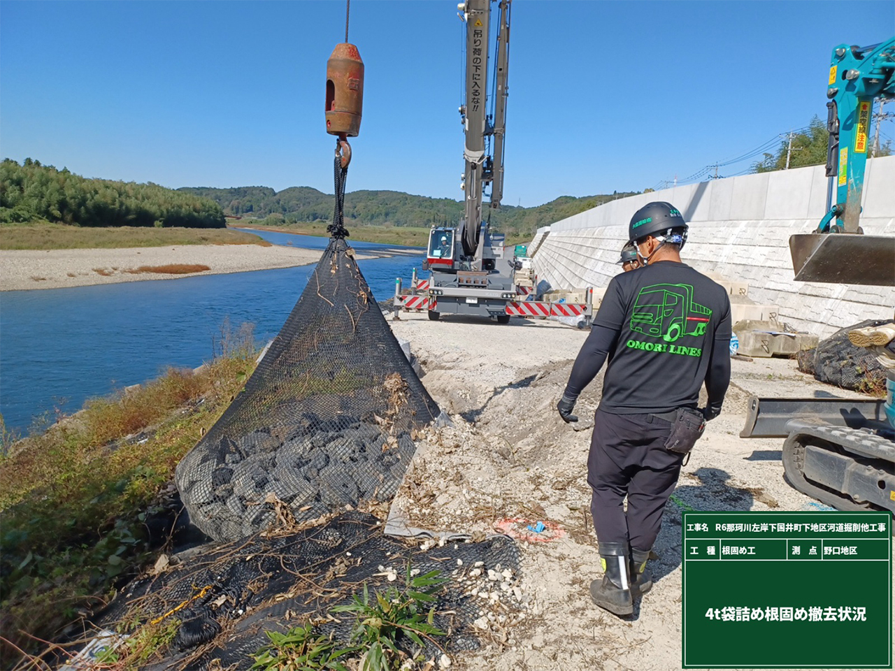 下圷地区に根固めを設置した日記「前線を守るのは」でお伝えしましたが、今回は、野口地区で4t袋詰め根固めの撤去作業を行っています。